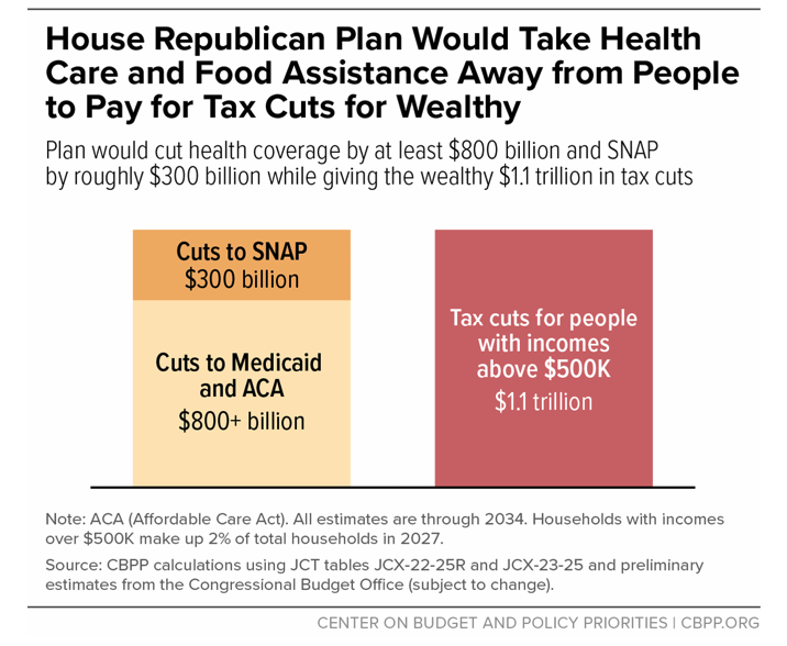 House Republicans are moving with a budget reconciliation bill that makes deep cuts to Medicaid and SNAP to pay for tax cuts to the ultra rich.